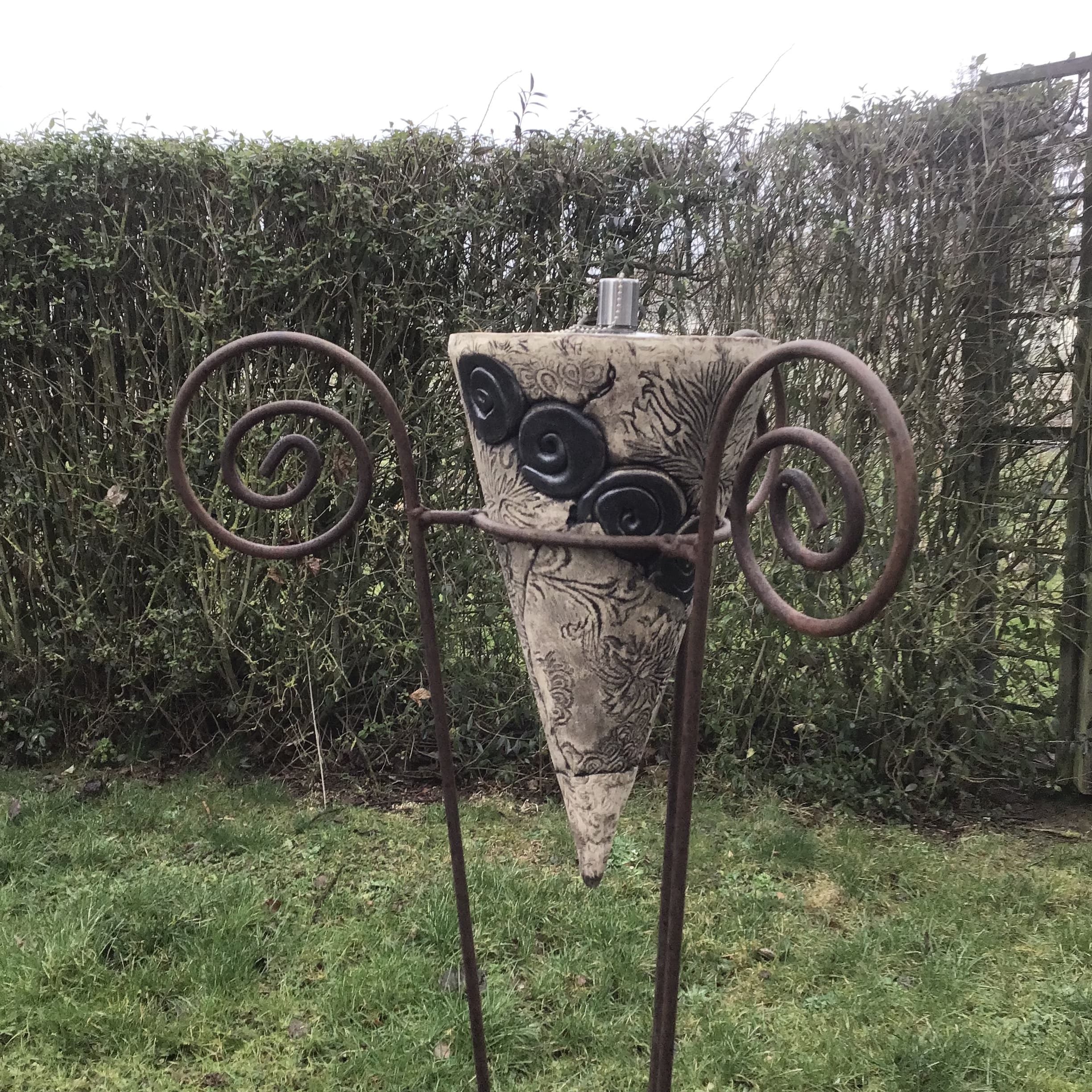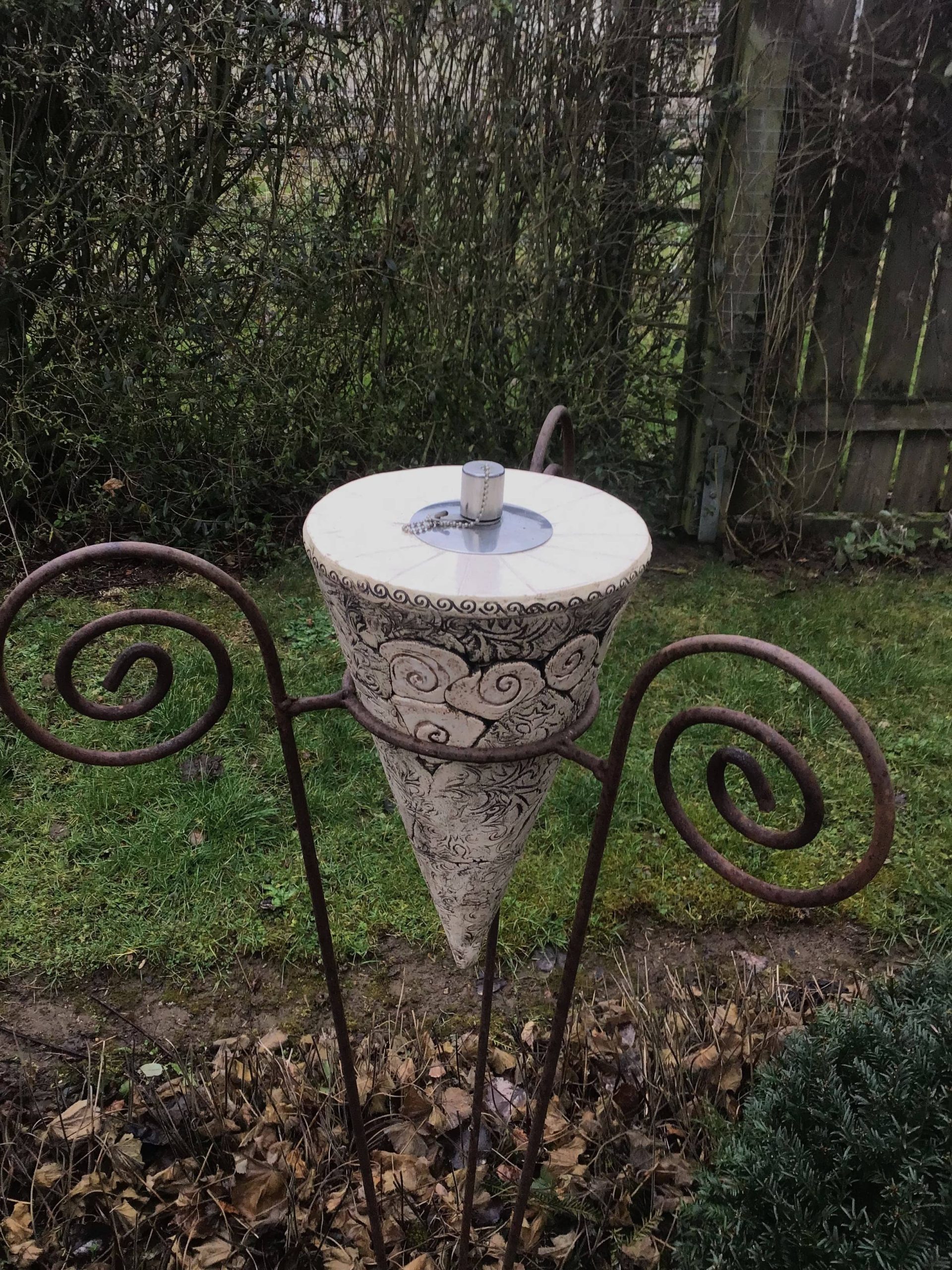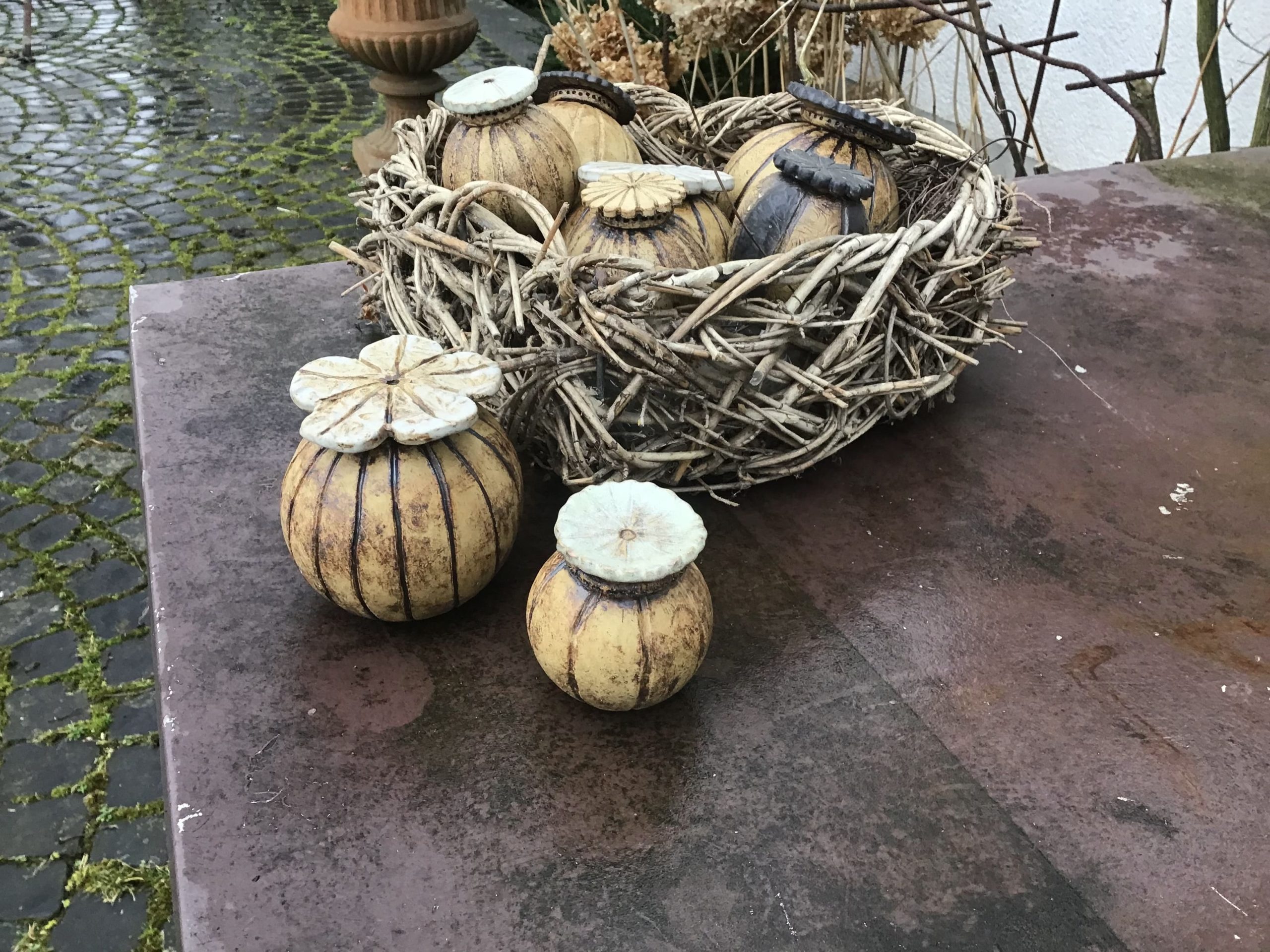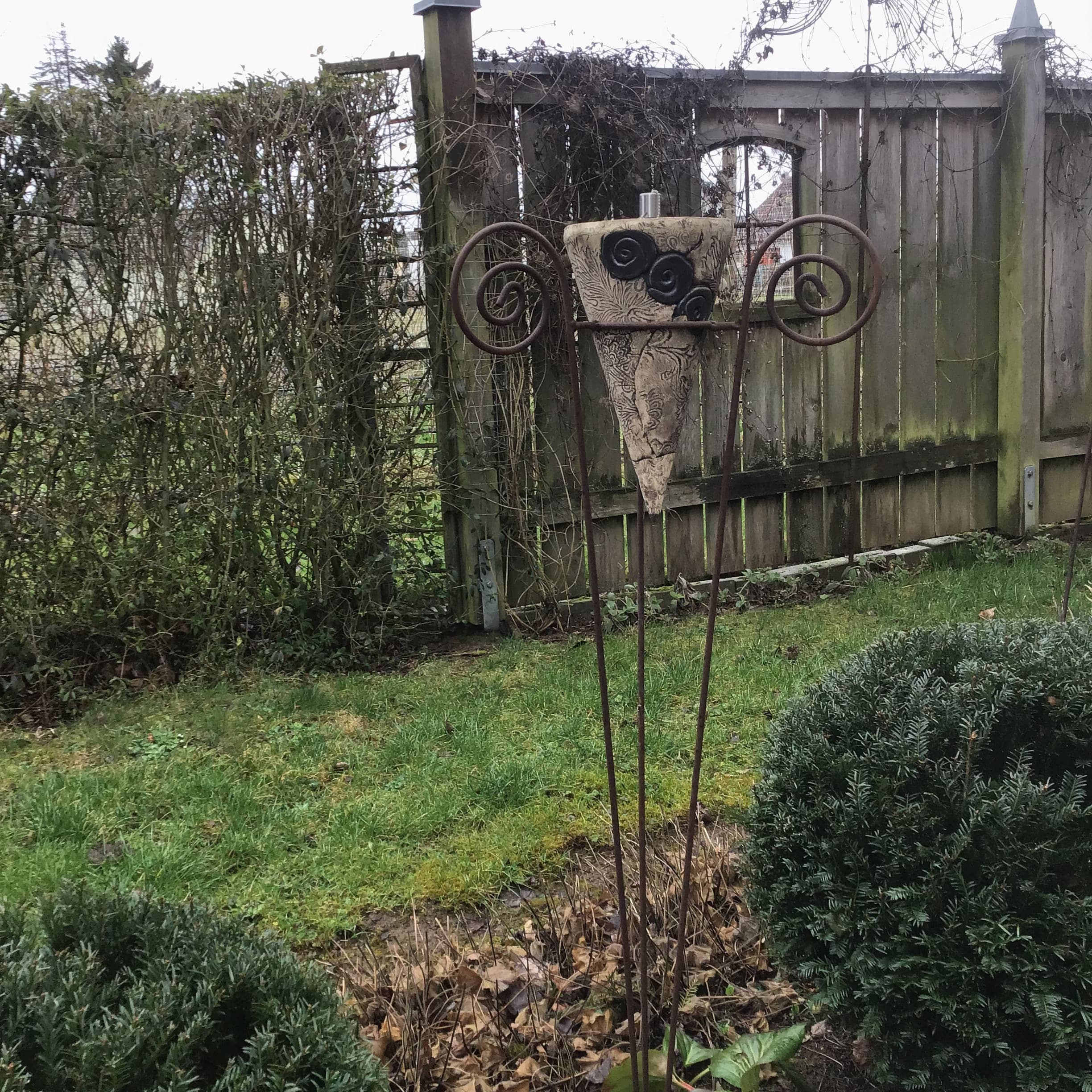 Schon sehr lange begeistert mich das kreative Gestalten mit dem Werkstoff Ton. Immer mal wieder besuchte ich schon in jungen Jahren Töpferkurse bei der VHS, konnte dadurch meine handwerklichen Fähigkeiten verfeinern, vieles dazulernen, was am Ende meine Kreativität noch beflügelte. Meine Arbeit im Garten, an der frischen Luft und in der Natur geben mir ständig neue Inspirationen, die nach Umsetzung rufen und gerne von mir erhört werden.Sehr oft trifft dabei meine fertige Töpferarbeit auf die Materialien Holz und Eisen, dessen Verbindung ich besonders spannend finde. Hier erhalte ich Unterstützung von meinem Mann, der die beiden Werkstoffe Holz und Metall gerne verarbeitet.
